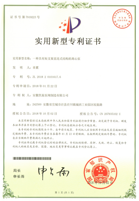 專利證書:一種具有短支架直連式結構的離心泵