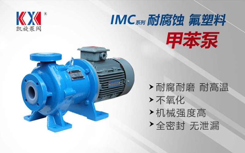 IMC型甲苯泵,過流部件使用氟塑料及合金復合材料制造,是應用磁力學原理,利用內外永磁體傳動,實現扭矩無接觸傳遞,當電動機帶動外轉子總成旋轉時,通過磁場的作用磁力線穿過隔離套帶動內轉子總成和葉輪同步旋轉,外轉子旋轉時隔離套靜止,隔離套將介質完全密封,從而達到無泄漏輸送介質的目的。解決了機械傳動泵的軸封跑、冒、滴現象。非常適合輸送任意濃度的酸、堿、有機溶劑、易燃易爆和貴重液體等。