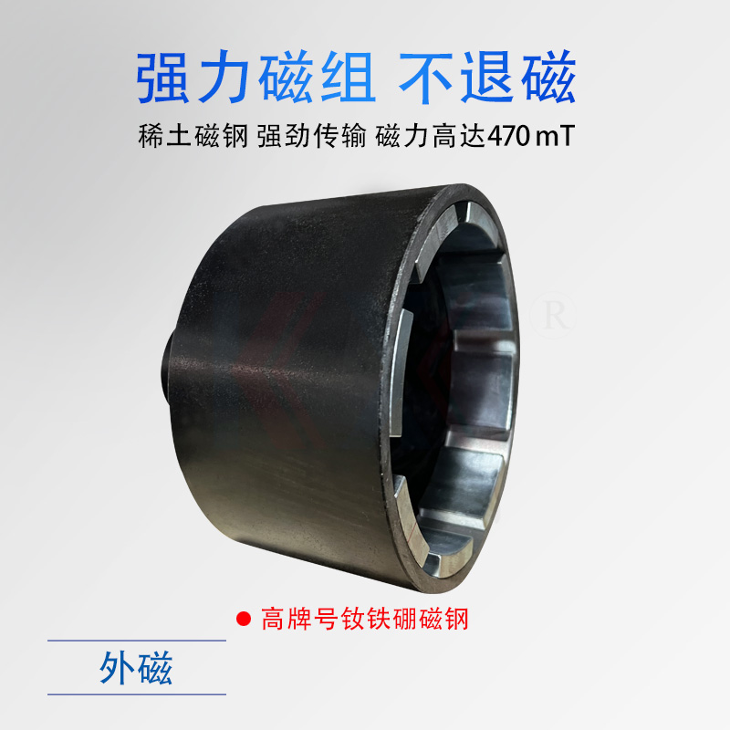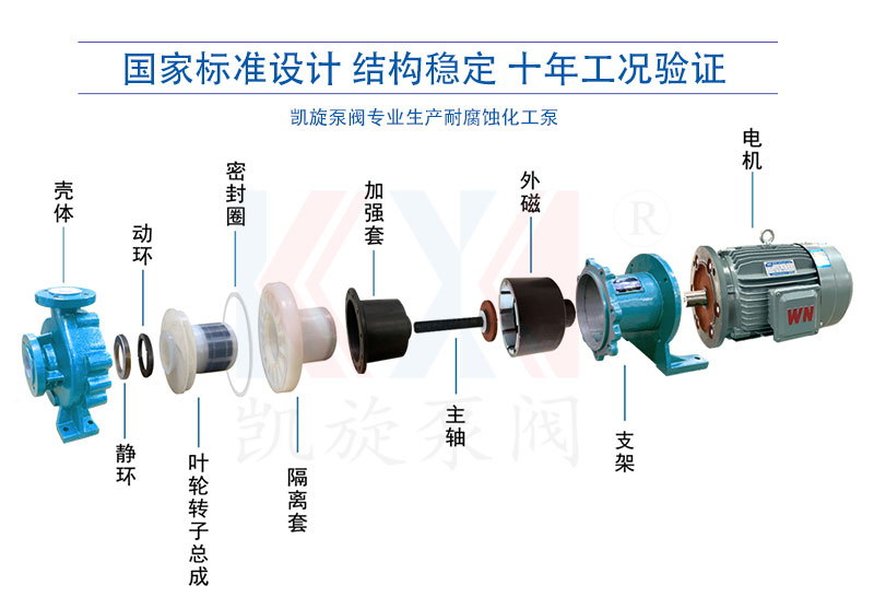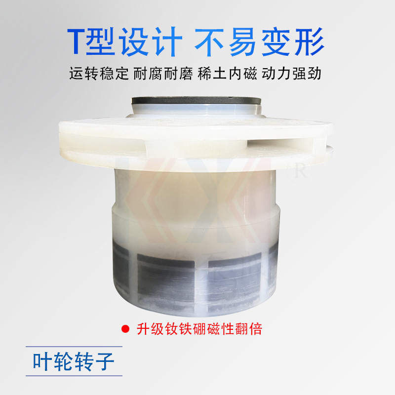 IMC硝酸泵,利用內外永磁體傳動,實現扭矩無接觸傳遞,當電動機帶動外轉子總成旋轉時,通過磁場的作用磁力線穿過隔離套帶動內轉子總成和葉輪同步旋轉,隔離套將介質完全密封,從而達到無泄漏輸送介質的目的。過流部件采用氟塑料及高純度碳化硅制成,具有良好的耐腐蝕性和密封性,安全無泄漏是輸送硝酸的很好選擇。選配時,1、密封圈選擇包氟圈或四氟圈;2、轉子和隔離套更換成PFA,普通的FEP在硝酸中會有溶脹變型。